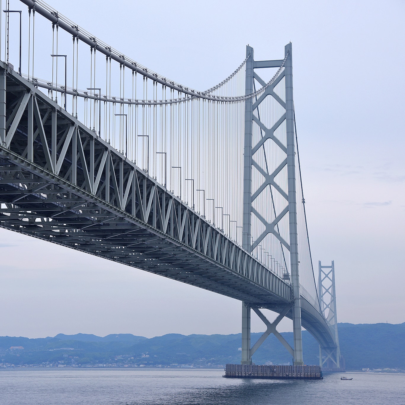明石海峡大橋は、橋桁を支える支間長1,991mという世界一の長さを誇っています。